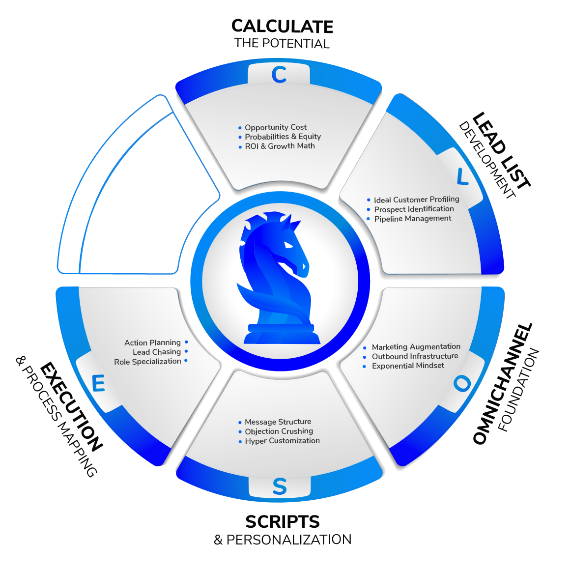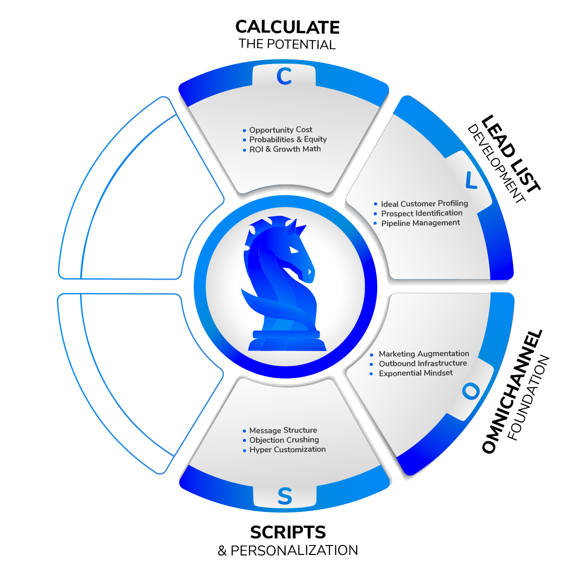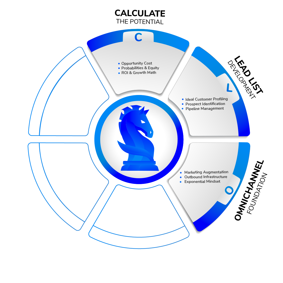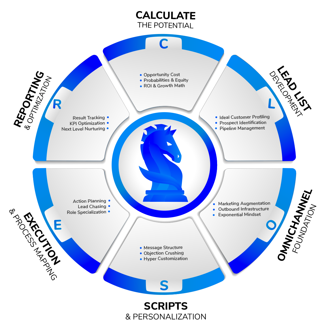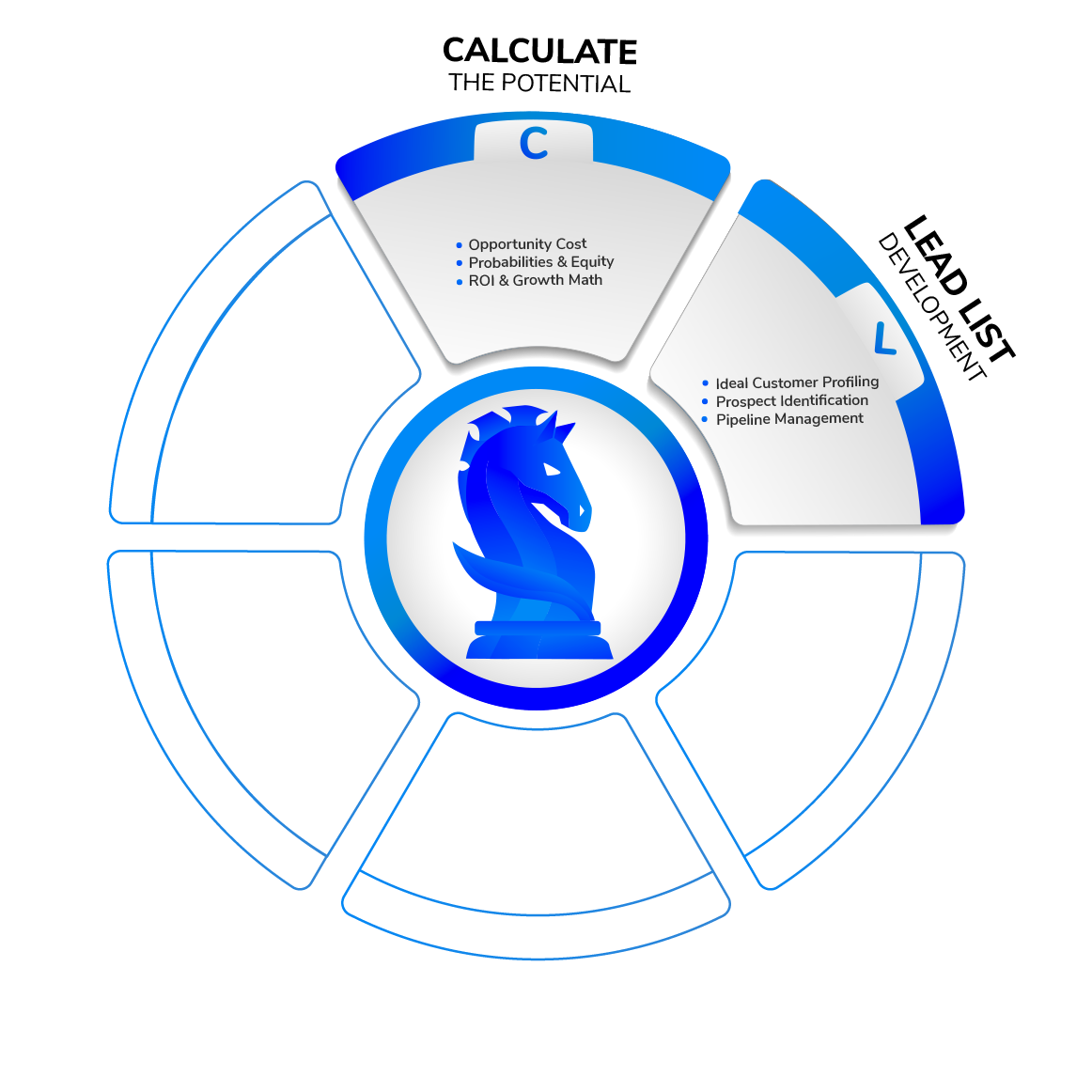 • First we identify the best way to tie in your marketing with your sales, and build trust with your leads through outbound, in what channels, and at at what velocity.